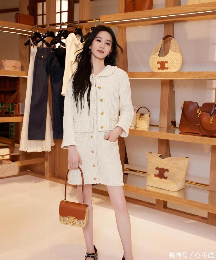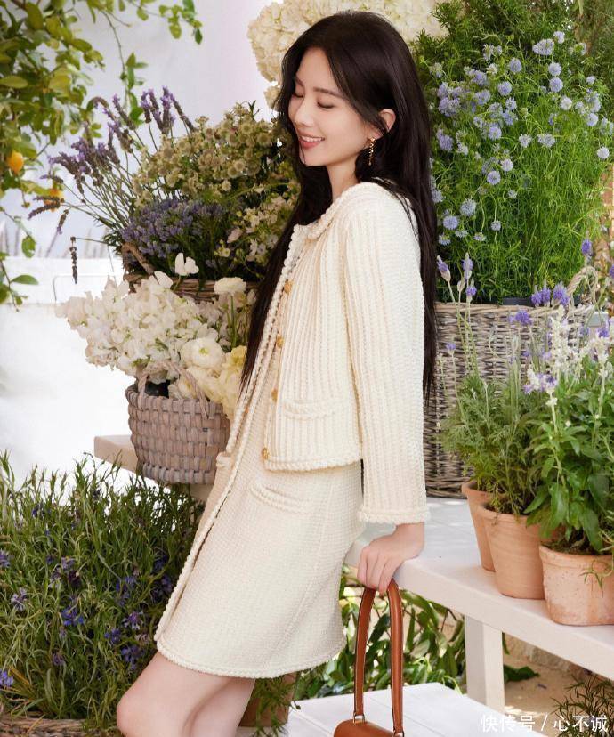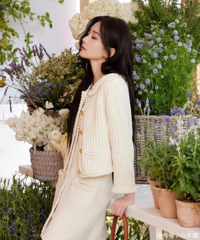 白色针织小香风套装,刘诗诗的这款穿搭也有着自然美的优雅和高级。裙装采取经典的白色,也是“自然美”的最佳载体。它不挑肤色,能提亮气色,让整体造型在花丛背景中更显清爽通透。